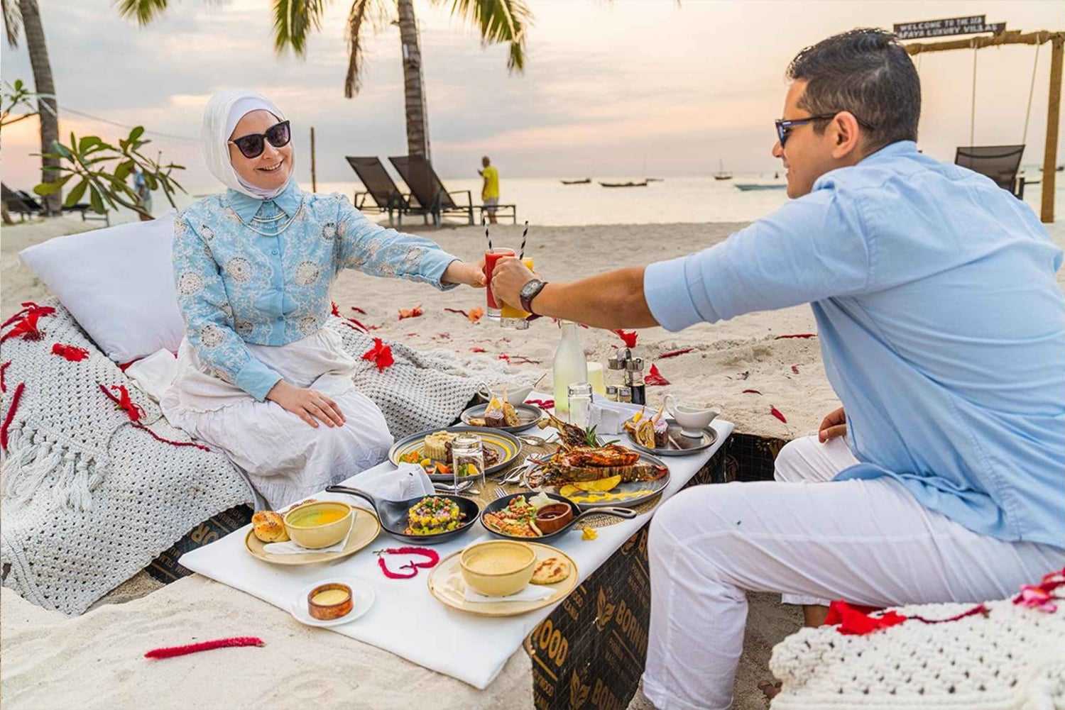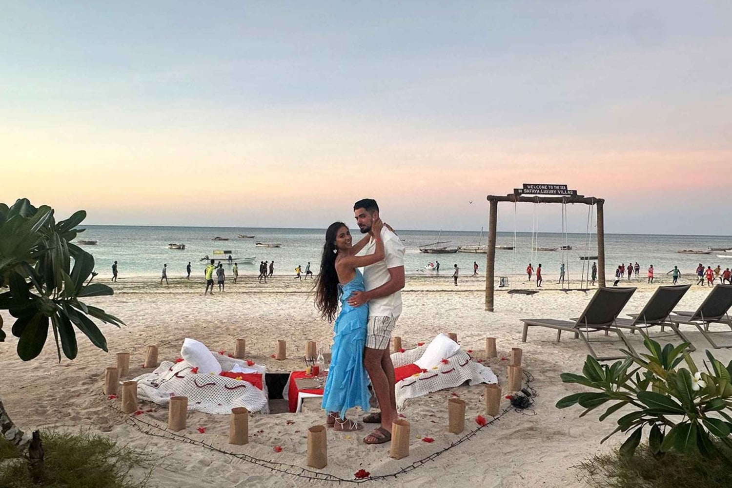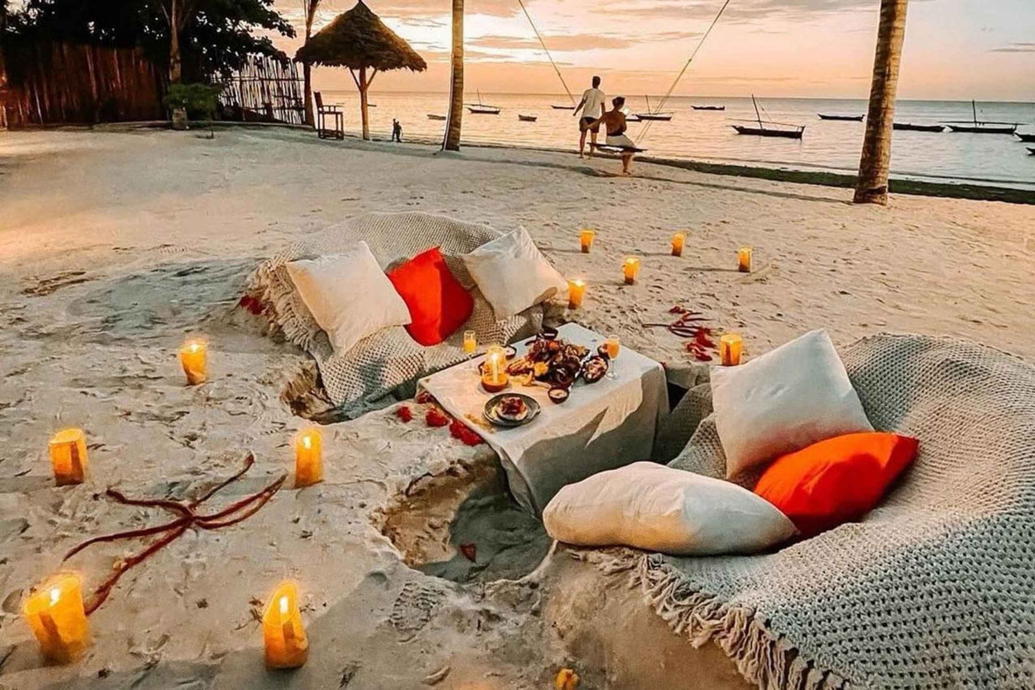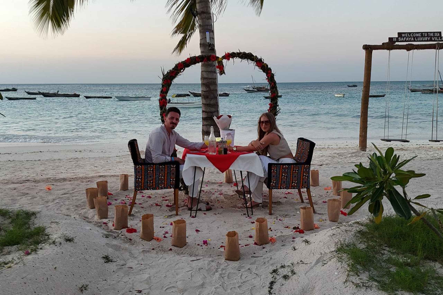 Sorprende a tu pareja con una velada mágica en la arena de la playa de Nungwi. Disfruta de una cena privada a la luz de las velas con una impresionante puesta de sol, mientras nuestro equipo captura impresionantes fotos aéreas de tu momento especial. Llegarás a la playa de Nungwi, uno de los lugares más bonitos de África Oriental para contemplar el atardecer. Tu mayordomo personal te recibirá y disfrutarás del ambiente romántico de una hoguera y velas. Saborea una deliciosa cena para dos, con opciones de menú personalizadas disponibles. Disfruta de refrescantes zumos tropicales o de cócteles sin alcohol mientras ves cómo el sol se esconde tras el horizonte. Los invitados pueden traer su propio vino o la bebida que prefieran. Captura la magia de la noche con una sesión de fotos y llévate de 10 a 15 fotos editadas. Mejora tu experiencia con un columpio de playa opcional y complementos de decoración adicionales, para que sea una escapada romántica realmente inolvidable.Includes