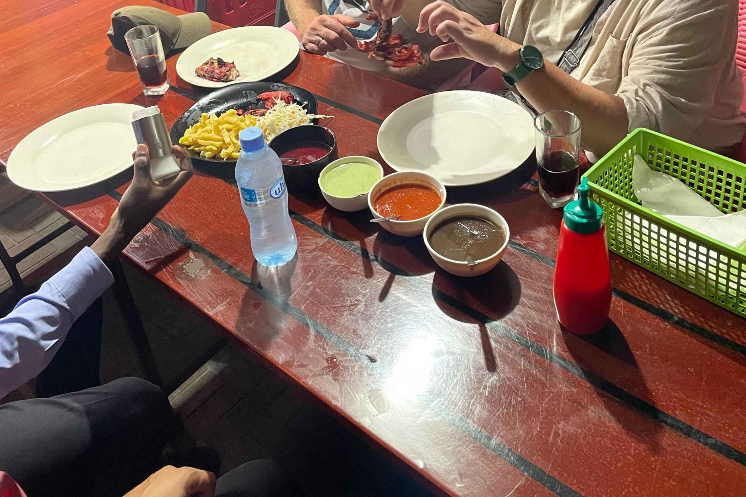 Tapaat oppaasi Golden Tulip Hotel City Centerin sisäänkäynnillä. Jos olet varannut noutopalvelun, oppaasi tapaa sinut hotellisi aulassa. Tutustu Dar es Salaamin aitoihin makuihin tällä opastetulla 10 maistajaisen ruokakierroksen aikana kaupungin vilkkailla kaduilla ja markkinoilla. Koe kaupungin afrikkalaisten, intialaisten ja arabialaisten vaikutteiden sekoitus, kun paikallinen opas vie sinut parhaisiin piilossa oleviin ruokapaikkoihin, joita paikalliset rakastavat. Nauti 10 aidosta maistajaisesta, jotka kuvaavat kaupungin monipuolista ruokakulttuuria. Kokeile mishkakia, paikallisilla mausteilla marinoituja hiiligrillattuja lihavartaita ja grillattua banaania, joka on yksinkertainen mutta ikoninen tansanialainen katuvälipala. Nauti ajam-leipää, pehmeää leipää, jossa on hienovaraisia intialais-arabialaisia vaikutteita, ja sokeriruokomehua, joka on vastapuristettua ja luonnollisen makeaa. Maistele Zanzibarin sekoitusta, Darin suosikkia, mausteista katuruokakeittoa, ja mandazia, kuohkeaa paistettua taikinaa, jossa on ripaus kookosta. Virkistäydy kookosvedellä, jota tarjoillaan suoraan kuoresta, ja maistele gajjar-kanaa, joka on maukasta maustettua grillattua kanaa. Nauti cassatajäätelöstä, värikkäästä paikallisesta jälkiruoasta, joka on peräisin Sansibarin perinnöstä, ja makeasta paanista, ihanasta aromaattisesta lehdestä, joka on täytetty makeilla mausteilla ja on täydellinen lopetus makunystyröidesi puhdistamiseen. Maistelujen välillä voit kävellä historiallisilla kaduilla, nähdä arkea ja kuulla tarinoita, jotka yhdistävät jokaisen ruokalajin Darin rikkaaseen monikulttuuriseen historiaan. Opas kertoo myös vinkkejä siitä, mistä löydät parhaat ruokatorit ja paikalliset erikoisuudet majoittumisesi aikana.Includes