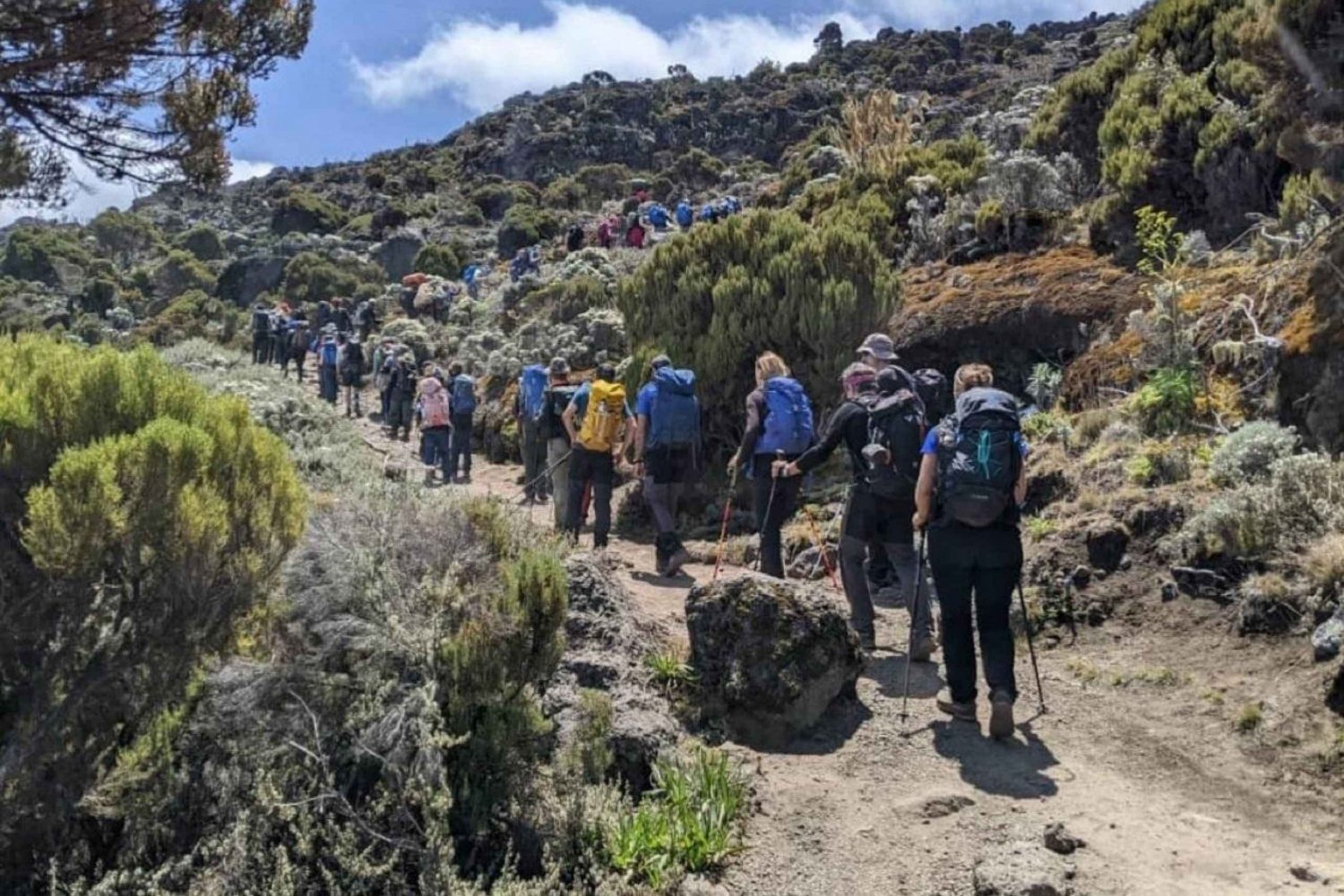 FOTTUR TIL KILIMANJARO: TOPPEN PÅ 7 DAGER VIA LEMOSHO-RUTEN Dag 1: Londorossi Gate til Mti Mkubwa Camp - Høyde over havet: 2100 meter til 2780 meter - Distanse: 6 km (3,7 miles) - Vandringstid: 3-4 timer - Habitat: Regnskog Etter registrering ved Londorossi Gate kan du begynne turen gjennom frodig regnskog. Du vil sannsynligvis få øye på svart-hvite colobusaper og andre dyr. Overnatting på Mti Mkubwa Camp (Big Tree Camp) Dag 2: Mti Mkubwa Camp til Shira 1 Camp - Høyde over havet: 2780 meter til 3500 meter - Avstand: 8 km (5 miles) - Vandringstid: 5-6 timer - Habitat: Myrland Stien går ut av regnskogen og inn i myrområdet, der vegetasjonen blir mer sparsom. Du kan nyte den fantastiske utsikten over Mount Meru i det fjerne. Leir ved Shira 1 Camp på Shira-platået Dag 3: Shira 1 Camp til Shira 2 Camp - Høyde over havet: 3500 meter til 3850 meter - Distanse: 7 km (4,3 miles) - Vandringstid: 3-4 timer - Habitat: Myrlandskap En relativt kort dag for å gi deg tid til akklimatisering. Stien krysser platået og gir panoramautsikt over Kibo Peak og det omkringliggende landskapet. Slå leir ved Shira 2 Camp Dag 4: Shira 2 Camp til Barranco Camp via Lava Tower - Høyde over havet: 3850 meter til 3960 meter (via 4600 meter) - Distanse: 10 km (6,2 miles) - Vandringstid: 7-8 timer - Habitat: Alpin ørken Vi klatrer opp til Lava Tower (en vulkansk fjellformasjon) for å akklimatisere oss, og går deretter ned til Barranco Camp. Denne dagen byr på fantastisk utsikt, men er utfordrende på grunn av høydeøkningen og nedstigningen. Dag 5: Barranco Camp til Karanga Camp - Høyde over havet: 3 960 meter til 4 035 meter - Avstand: 5 km 5 km (3,1 miles) - Vandringstid: 4-5 timer - Habitat: Alpin ørken Dagen starter med den utfordrende Barranco Wall, en bratt klatring med fantastisk utsikt. Etterpå blir stien slakere når du kommer til Karanga Camp. Dag 6: Karanga Camp til Barafu Camp - Høyde over havet: 4 035 meter til 4 673 meter - Avstand: 4 km (2,5 miles) - Vandringstid: 3-4 timer - Habitat: Alpin ørken En kortere dag for å spare energi til toppforsøket. Etter å ha nådd Barafu Camp, hviler du og forbereder deg på oppstigningen tidlig om morgenen. Dag 7: Barafu Camp til Uhuru Peak til Mweka Camp - Høyde over havet: 4 673 meter til 5 895 meter til 3 068 meter - Distanse: 17 km (10,5 miles) - Vandringstid: 12-15 timer (7-8 timer til toppen, 4-7 timer nedover) - Habitat: Arktis (toppen) og regnskog (nedstigningen) Begynn toppturen ved midnatt, og nå Uhuru Peak ved soloppgang for en uforglemmelig utsikt. Gå ned gjennom den frodige regnskogen til Mweka Gate, hvor du mottar toppsertifikatet ditt. Transfer tilbake til Moshi eller Arusha.Includes